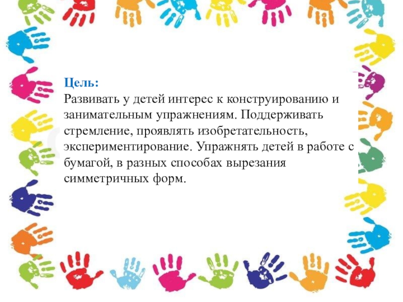 Цель: Развивать у детей интерес к конструированию и занимательным упражнениям. Поддерживать стремление, проявлять изобретательность, экспериментирование. Упражнять детей в работе с бумагой, в разных способах вырезания симметричных форм.