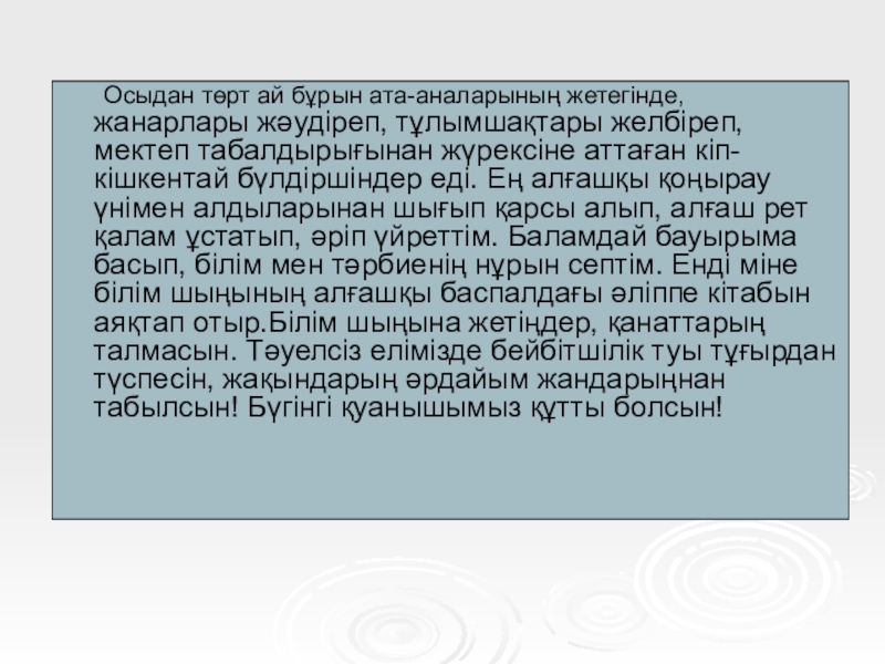 жәудіреп, тұлымшақтары желбіреп, мектеп табалдырығынан жүрексіне аттаған кіп-кішкентай бүлдіршіндер еді. Ең алғашқы қоңырау үнімен алдыларынан шығып қарсы алып, алғаш рет қалам ұстатып, әріп үйреттім. Баламдай бауырыма басып, білім мен тәрбиенің нұрын септім. Енді міне білім шыңының алғашқы баспалдағы әліппе кітабын аяқтап отыр.Білім шыңына жетіңдер, қанаттарың талмасын. Тәуелсіз елімізде бейбітшілік туы тұғырдан түспесін, жақындарың әрдайым жандарыңнан табылсын! Бүгінгі қуанышымыз құтты болсын!
