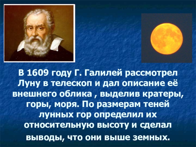 описание её внешнего облика , выделив кратеры, горы, моря. По размерам теней лунных гор определил их относительную высоту и сделал выводы, что они выше земных.