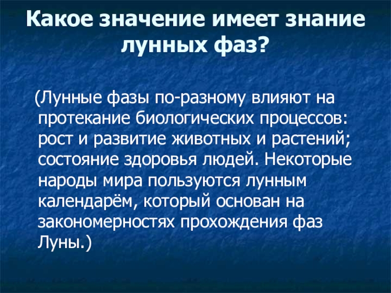 протекание биологических процессов: рост и развитие животных и растений; состояние здоровья людей. Некоторые народы мира пользуются лунным календарём, который основан на закономерностях прохождения фаз Луны.)
