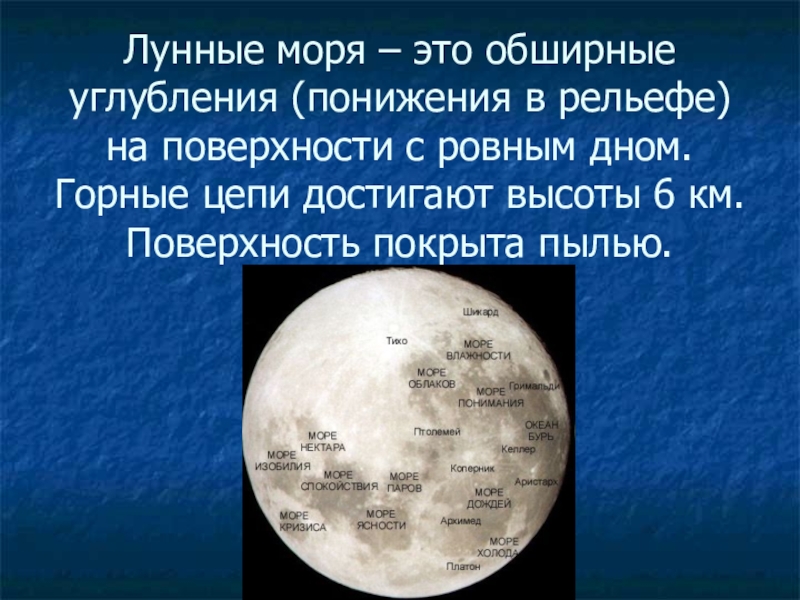 Лунные моря – это обширные углубления (понижения в рельефе) на поверхности с ровным дном. Горные цепи достигают