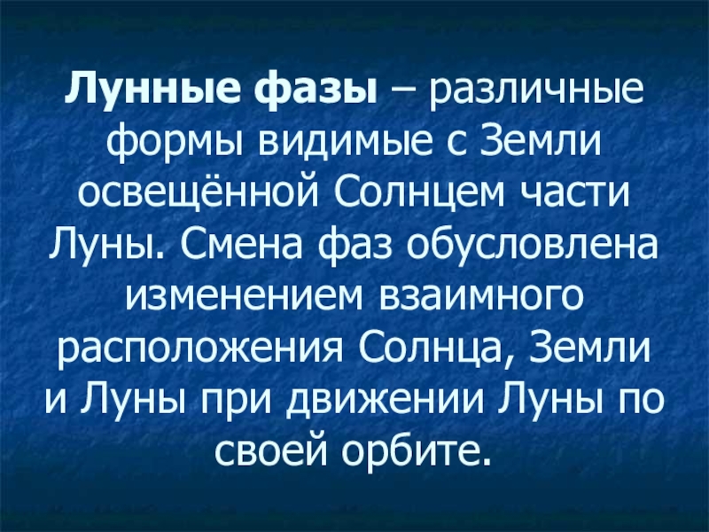 Лунные фазы – различные формы видимые с Земли освещённой Солнцем части Луны. Смена фаз обусловлена изменением взаимного