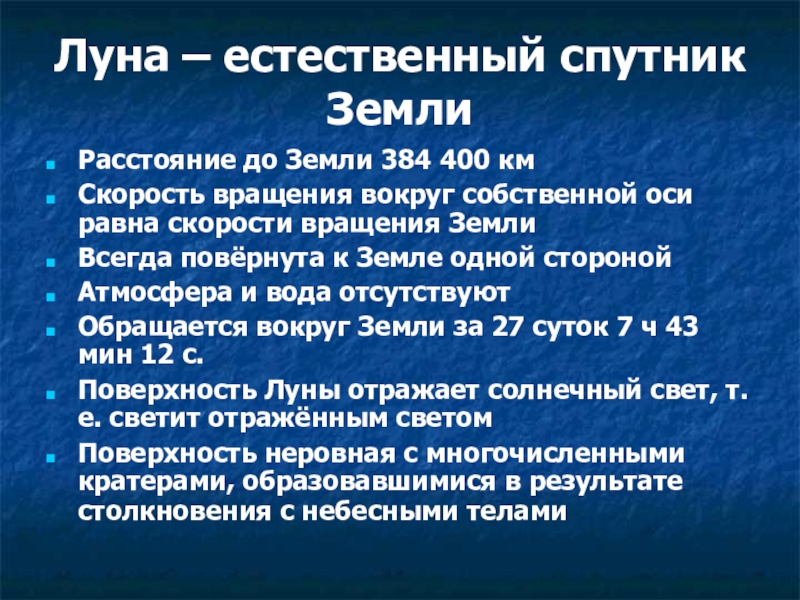 Луна – естественный спутник ЗемлиРасстояние до Земли 384 400 кмСкорость вращения вокруг собственной оси равна скорости вращения