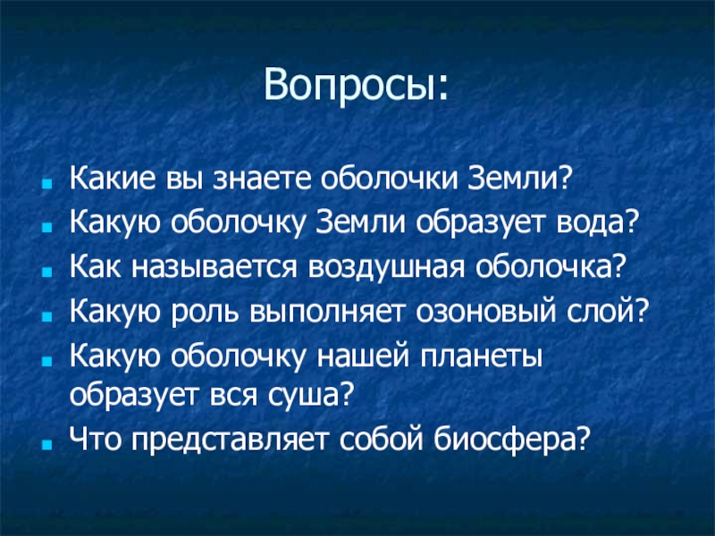 Вопросы:Какие вы знаете оболочки Земли?Какую оболочку Земли образует вода?Как называется воздушная оболочка?Какую роль выполняет озоновый слой?Какую оболочку