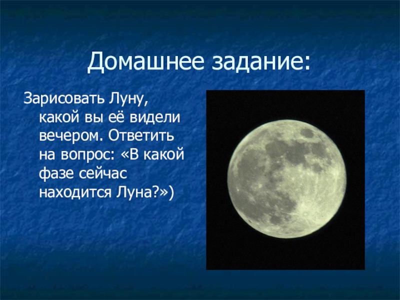 Домашнее задание:Зарисовать Луну, какой вы её видели вечером. Ответить на вопрос: «В какой фазе сейчас находится Луна?»)