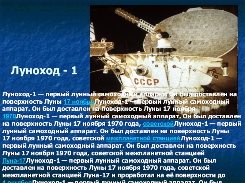 поверхность Луны 17 ноябряЛуноход-1 — первый лунный самоходный аппарат. Он был доставлен на поверхность Луны 17 ноября 1970Луноход-1 — первый лунный самоходный аппарат. Он был доставлен на поверхность Луны 17 ноября 1970 года, советскойЛуноход-1 — первый лунный самоходный аппарат. Он был доставлен на поверхность Луны 17 ноября 1970 года, советской межпланетной станциейЛуноход-1 — первый лунный самоходный аппарат. Он был доставлен на поверхность Луны 17 ноября 1970 года, советской межпланетной станцией Луна-17Луноход-1 — первый лунный самоходный аппарат. Он был доставлен на поверхность Луны 17 ноября 1970 года, советской межпланетной станцией Луна-17 и проработал на её поверхности до 4 октябряЛуноход-1 — первый лунный самоходный аппарат. Он был доставлен на поверхность Луны 17 ноября 1970 года, советской межпланетной станцией Луна-17 и проработал на её поверхности до 4 октября 1971 года. Предназначался для изучения особенностей лунной поверхности, радиоактивного и рентгеновского и космического излучения на Луне, химического состава и свойств грунта.
