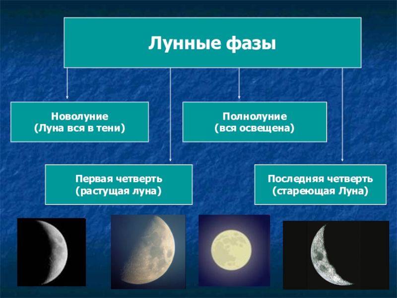 Лунные фазыНоволуние(Луна вся в тени)Первая четверть(растущая луна)Полнолуние(вся освещена)Последняя четверть(стареющая Луна)