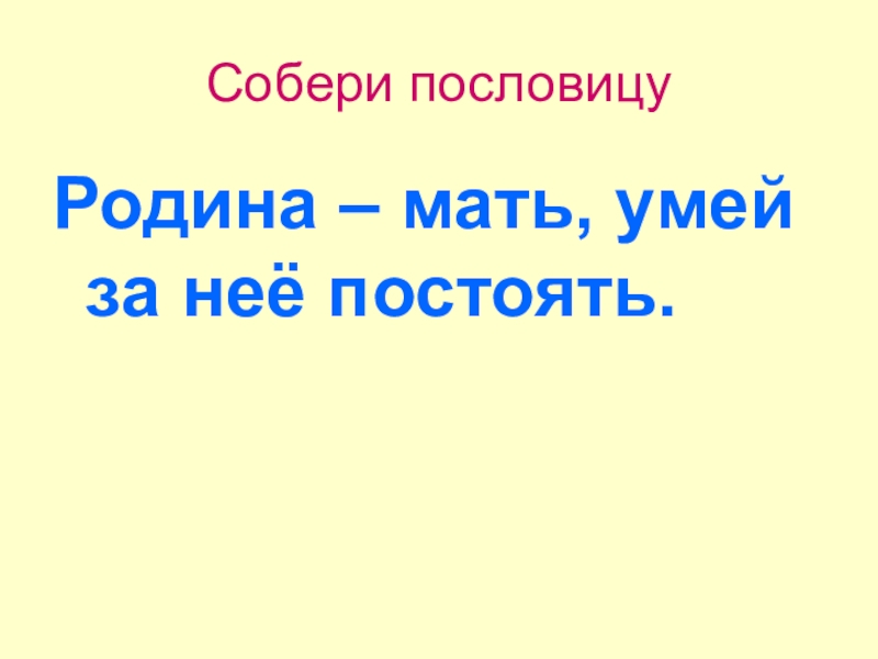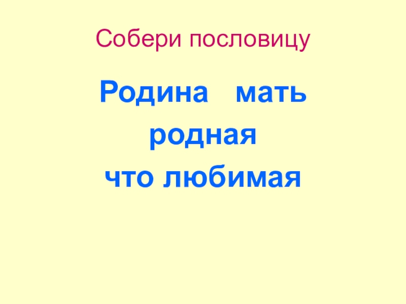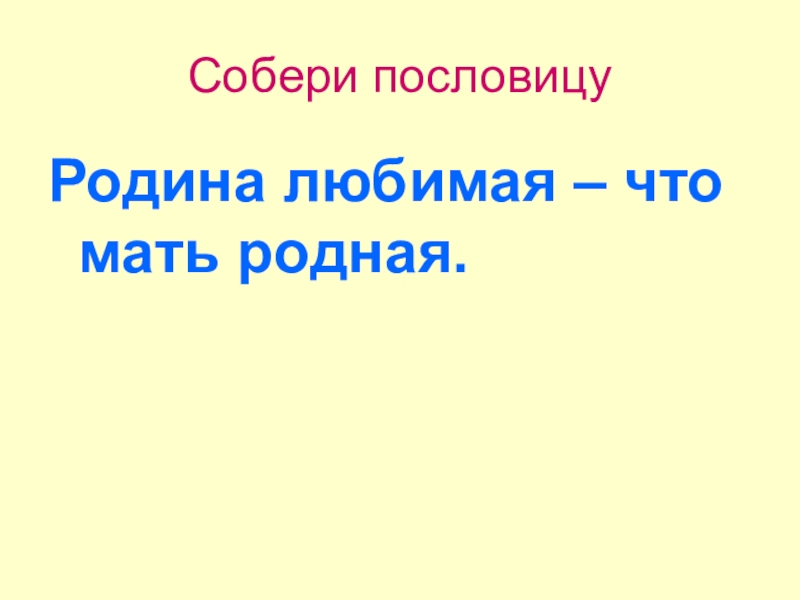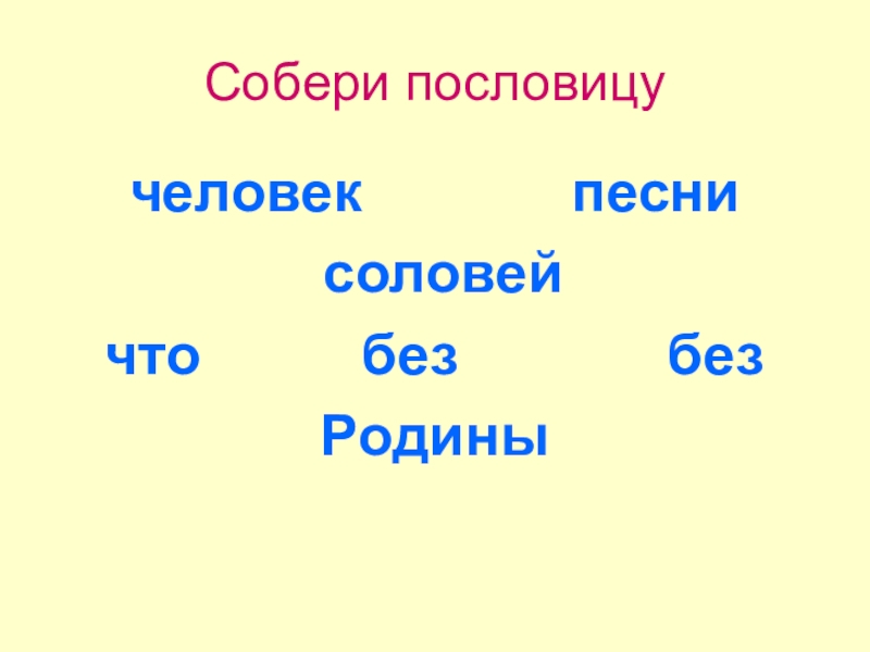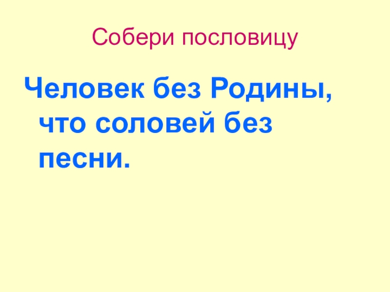 Собери пословицуЧеловек без Родины, что соловей без песни.