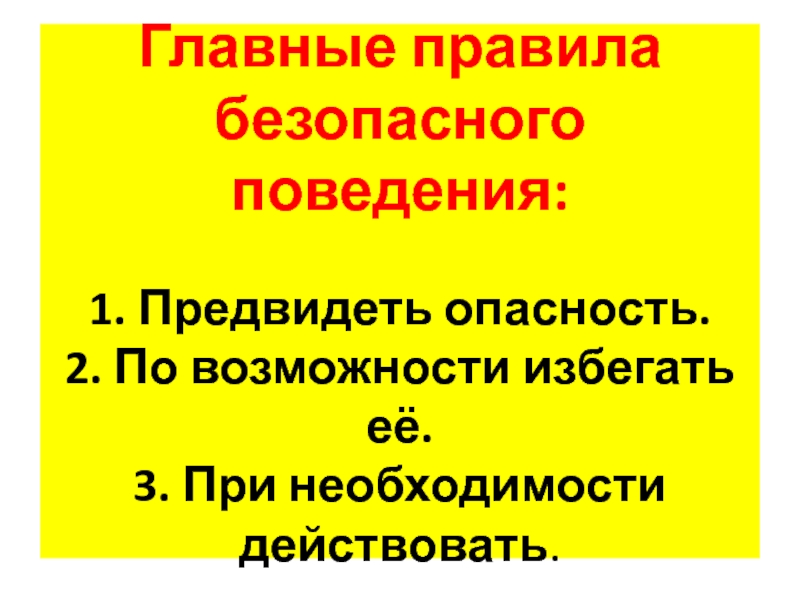 Главные правила безопасного поведения: 1. Предвидеть опасность. 2. По возможности избегать её. 3. При необходимости действовать.