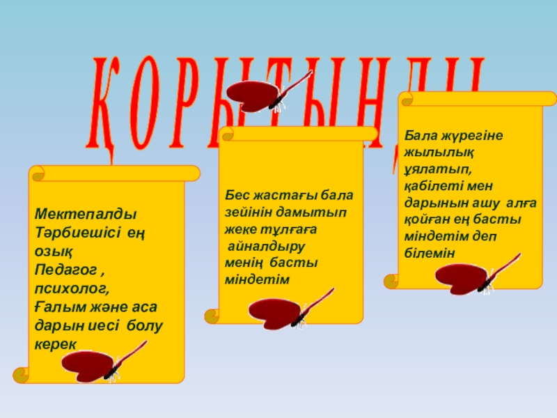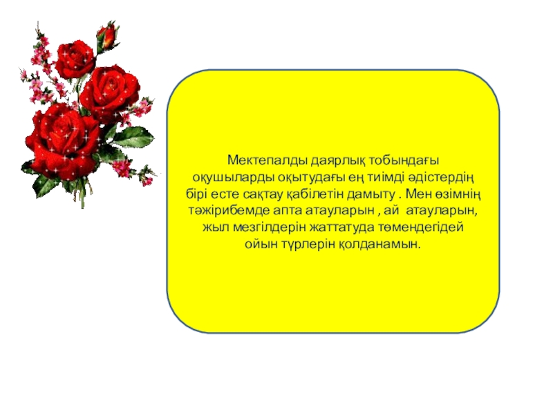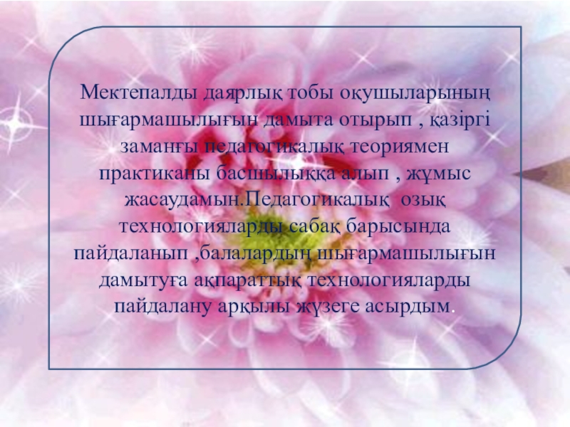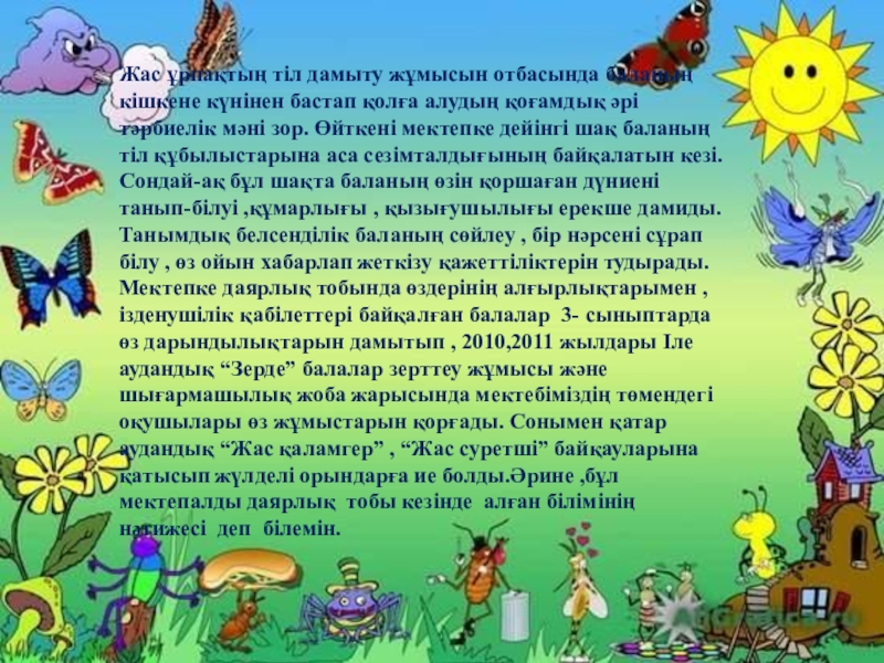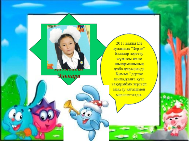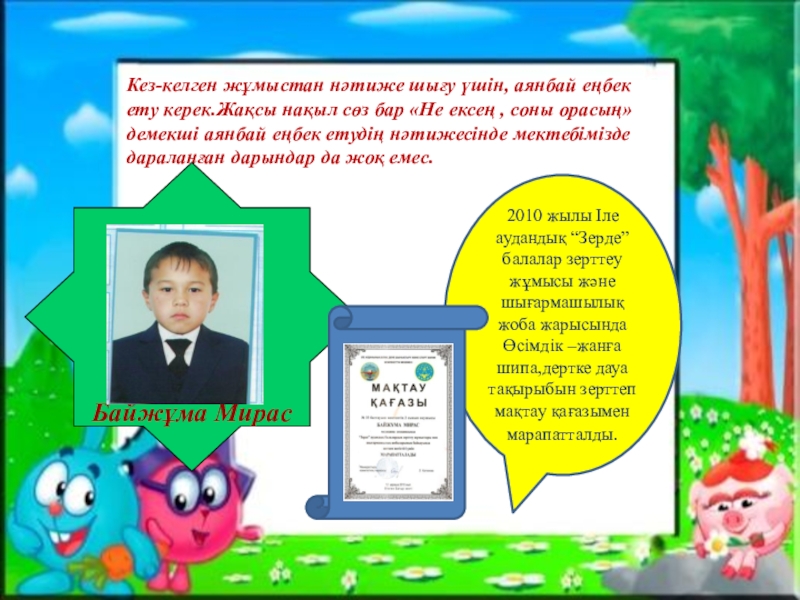 2010 жылы Іле аудандық “Зерде” балалар зерттеу жұмысы және шығармашылық жоба жарысында Өсімдік –жанға шипа,дертке дауа тақырыбын зерттеп мақтау қағазымен марапатталды.