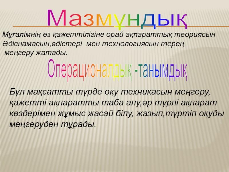 Бұл мақсатты түрде оқу техникасын меңгеру,қажетті ақпаратты таба алу,әр түрлі ақпарат көздерімен жұмыс жасай білу, жазып,түртіп оқуды меңгеруден тұрады.