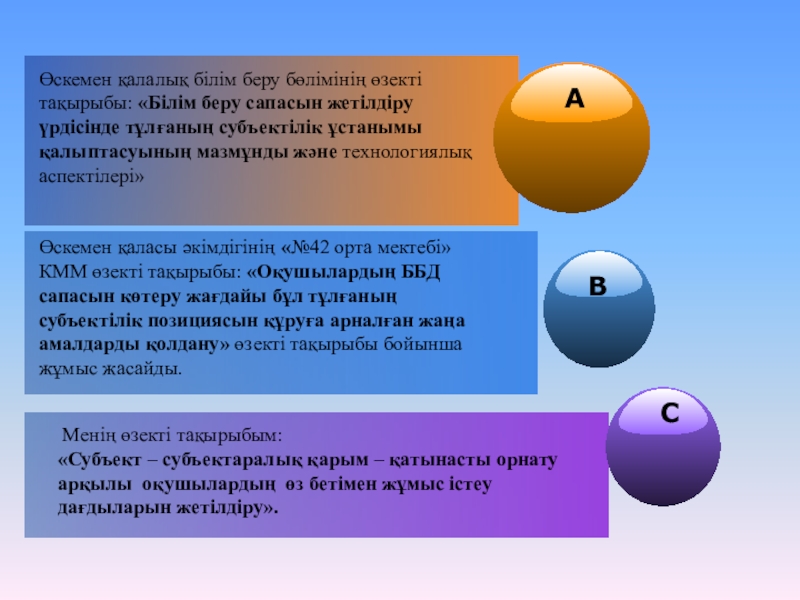 Өскемен қаласы әкімдігінің «№42 орта мектебі» КММ өзекті тақырыбы: «Оқушылардың ББД сапасын көтеру жағдайы бұл тұлғаның субъектілік позициясын құруға арналған жаңа амалдарды қолдану» өзекті тақырыбы бойынша жұмыс жасайды.