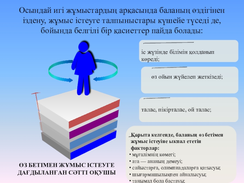 Осындай игі жұмыстардың арқасында баланың өздігінен іздену, жұмыс істеуге талпыныстары күшейе түседі де, бойында белгілі бір қасиеттер пайда болады: