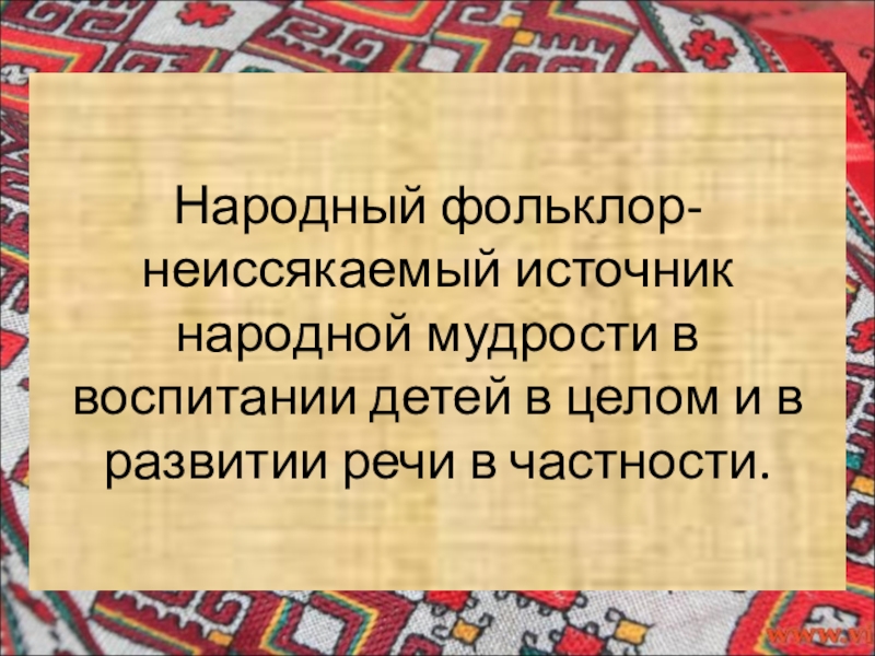 Слайд 11Народный фольклор- неиссякаемый источник народной мудрости в воспитании детей в целом
