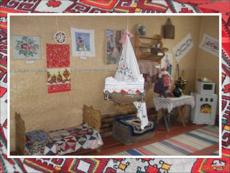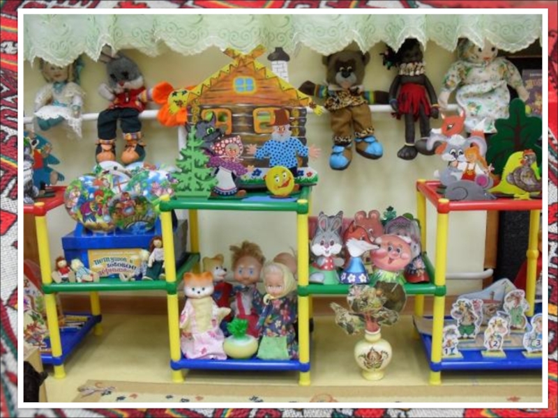 искусства ( карнизы, панно, пособия в игровых уголках, мягкие игрушки из ткани, самодельные куклы в национальных костюмах, различные виды театров); 2. создание горницы поможет ввести детей в особый самобытный мир национальной старины путем его действенного познания; 3. использование фольклора в планировании занятий и в режимных моментах.
