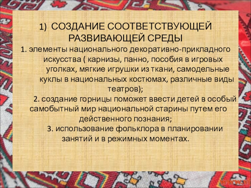 1) СОЗДАНИЕ СООТВЕТСТВУЮЩЕЙ РАЗВИВАЮЩЕЙ СРЕДЫ 1. элементы национального декоративно-прикладного       искусства (