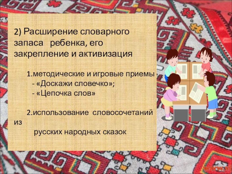 Слайд 6 2) Расширение словарного запаса ребенка, его закрепление и активизация