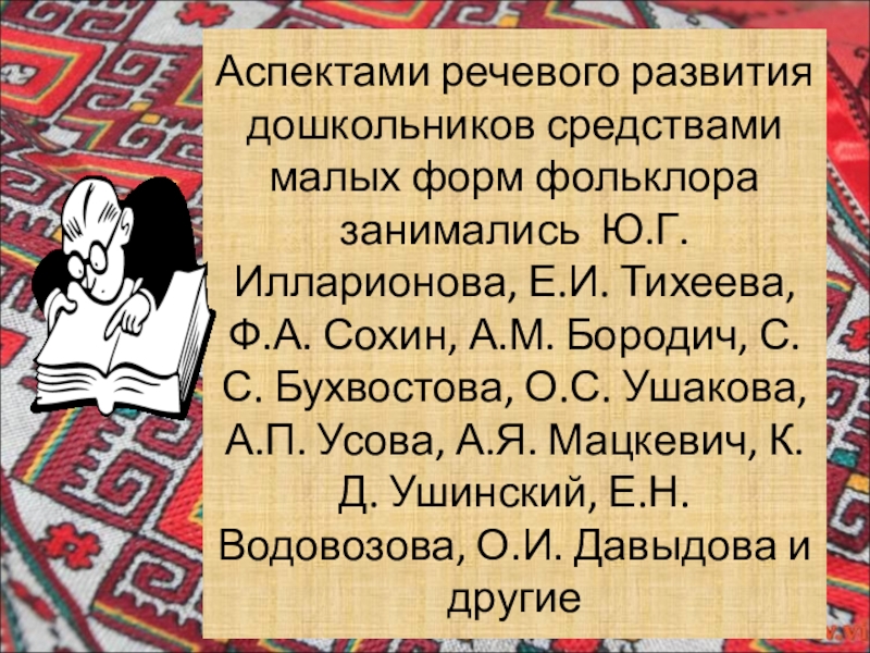 Слайд 2Аспектами речевого развития дошкольников средствами малых форм фольклора занимались Ю.Г. Илларионова,