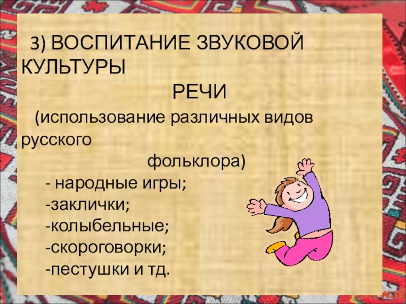 Слайд 7 3) ВОСПИТАНИЕ ЗВУКОВОЙ КУЛЬТУРЫ