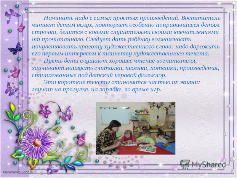 Слайд 9 Начинать надо с самых простых произведений. Воспитатель читает детям вслух, повторяет