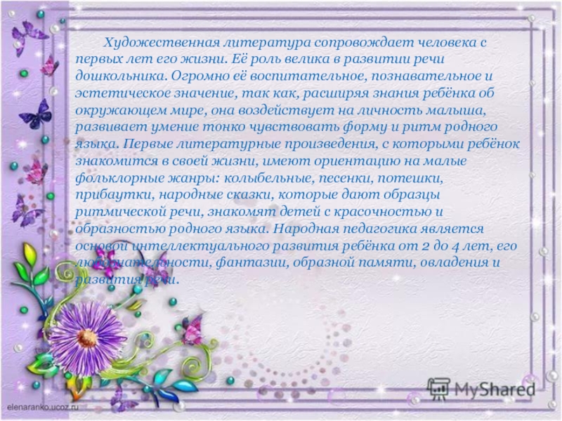велика в развитии речи дошкольника. Огромно её воспитательное, познавательное и эстетическое значение, так как, расширяя знания ребёнка об окружающем мире, она воздействует на личность малыша, развивает умение тонко чувствовать форму и ритм родного языка. Первые литературные произведения, с которыми ребёнок знакомится в своей жизни, имеют ориентацию на малые фольклорные жанры: колыбельные, песенки, потешки, прибаутки, народные сказки, которые дают образцы ритмической речи, знакомят детей с красочностью и образностью родного языка. Народная педагогика является основой интеллектуального развития ребёнка от 2 до 4 лет, его любознательности, фантазии, образной памяти, овладения и развития речи.