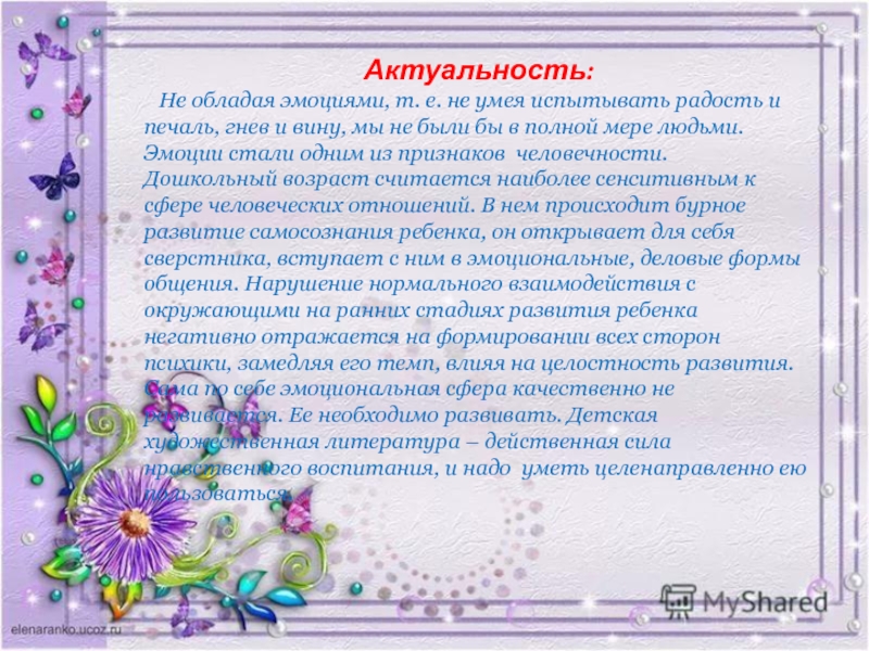 Дошкольный возраст считается наиболее сенситивным к сфере человеческих отношений. В нем происходит бурное развитие самосознания ребенка, он открывает для себя сверстника, вступает с ним в эмоциональные, деловые формы общения. Нарушение нормального взаимодействия с окружающими на ранних стадиях развития ребенка негативно отражается на формировании всех сторон психики, замедляя его темп, влияя на целостность развития. Сама по себе эмоциональная сфера качественно не развивается. Ее необходимо развивать. Детская художественная литература – действенная сила нравственного воспитания, и надо уметь целенаправленно ею пользоваться.
