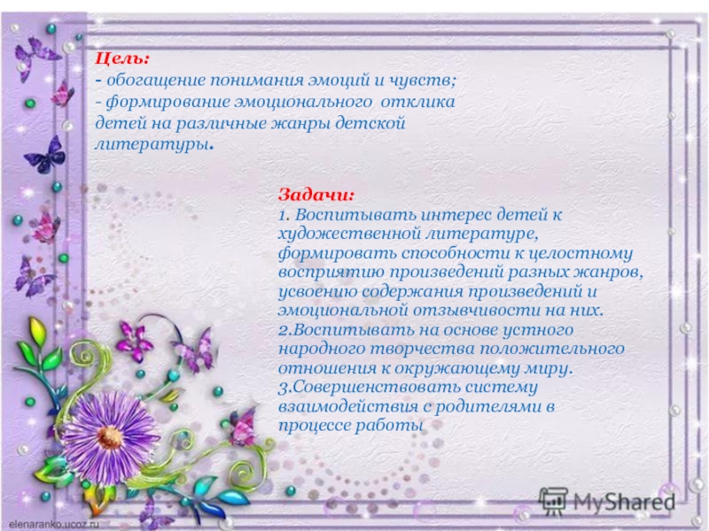 1. Воспитывать интерес детей к художественной литературе, формировать способности к целостному восприятию произведений разных жанров, усвоению содержания произведений и эмоциональной отзывчивости на них.