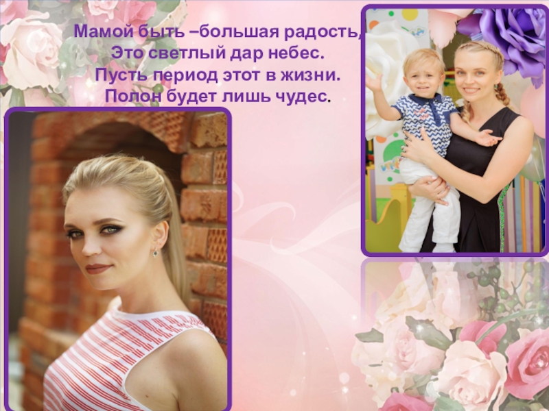 Мамой быть –большая радость,Это светлый дар небес.Пусть период этот в жизни.Полон будет лишь чудес.