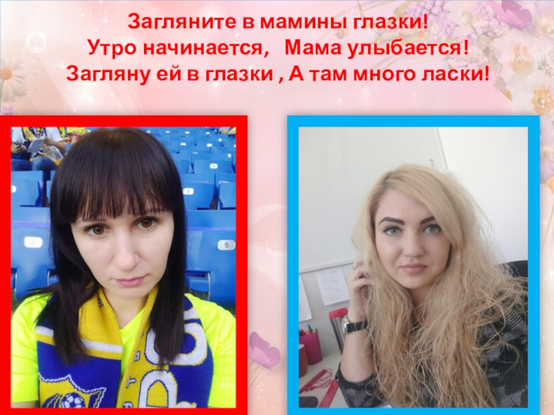 Загляните в мамины глазки!Утро начинается,  Мама улыбается!Загляну ей в глазки , А там много ласки!