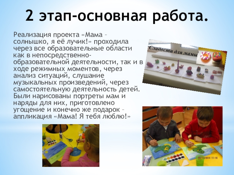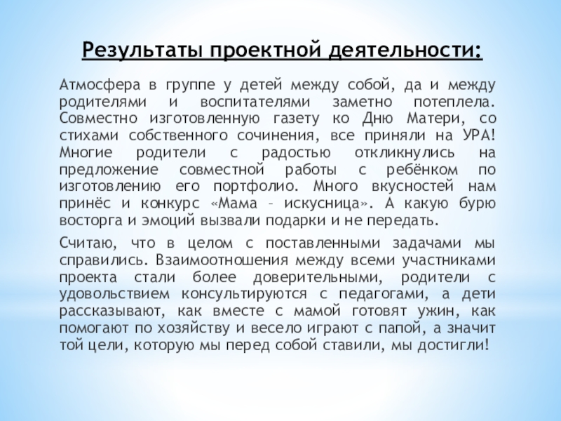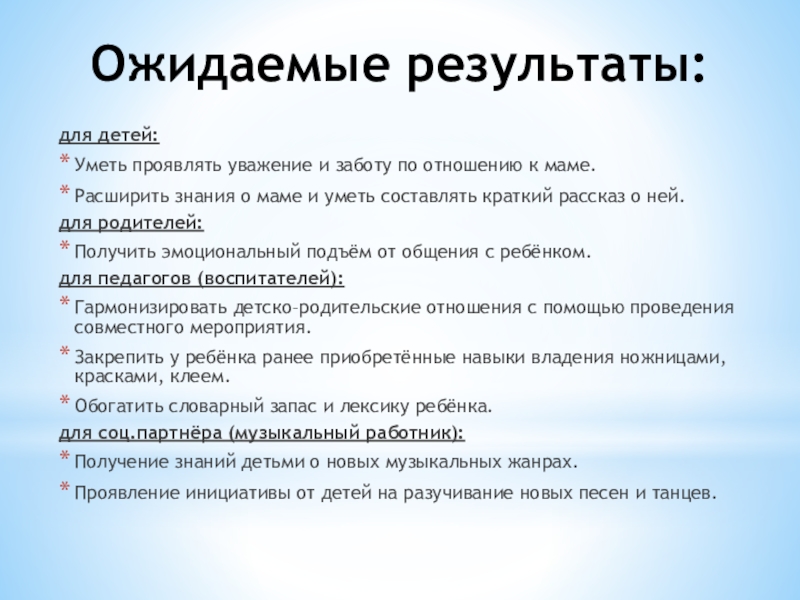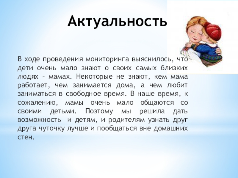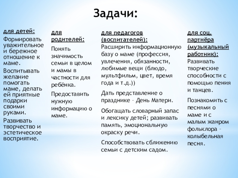 Расширить информационную базу о маме (профессия, увлечения, обязанности, любимые вещи (блюдо, мультфильм, цвет, время года и т.д.))