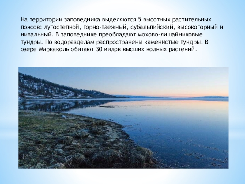 Слайд 5На территории заповедника выделяются 5 высотных растительных поясов: лугостепной, горно-таежный, субальпийский,