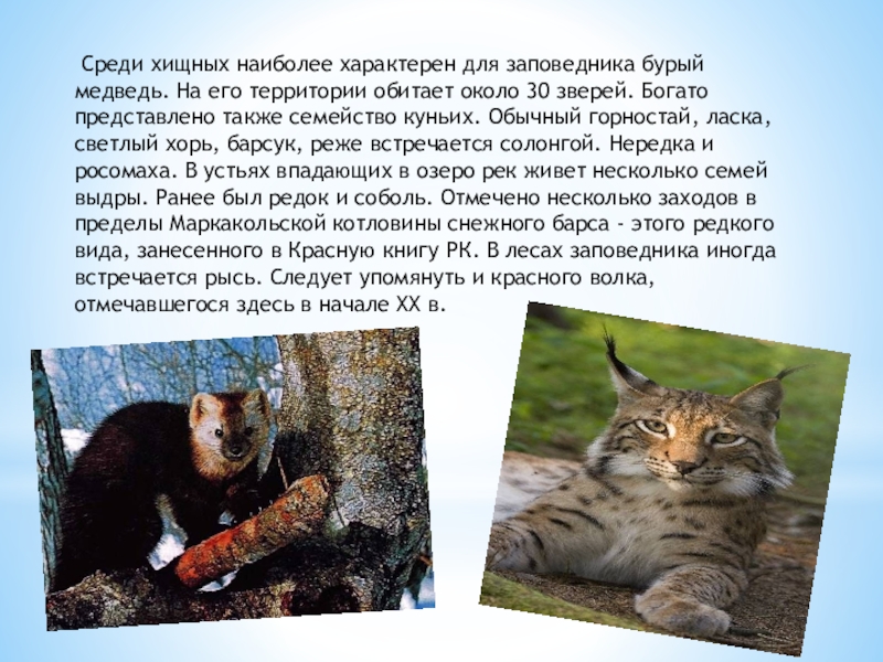 Слайд 7 Среди хищных наиболее характерен для заповедника бурый медведь. На его