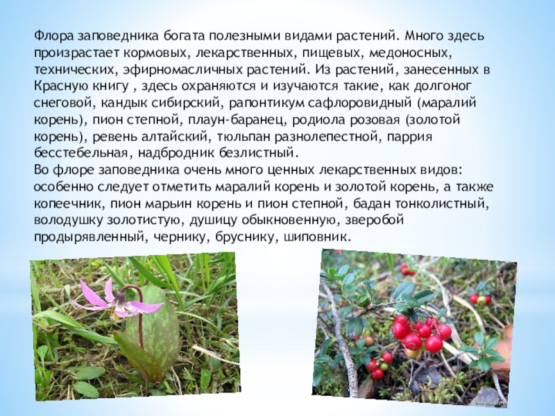 Слайд 6Флора заповедника богата полезными видами растений. Много здесь произрастает кормовых, лекарственных,