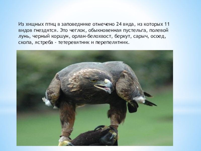 Слайд 8Из хищных птиц в заповеднике отмечено 24 вида, из которых 11