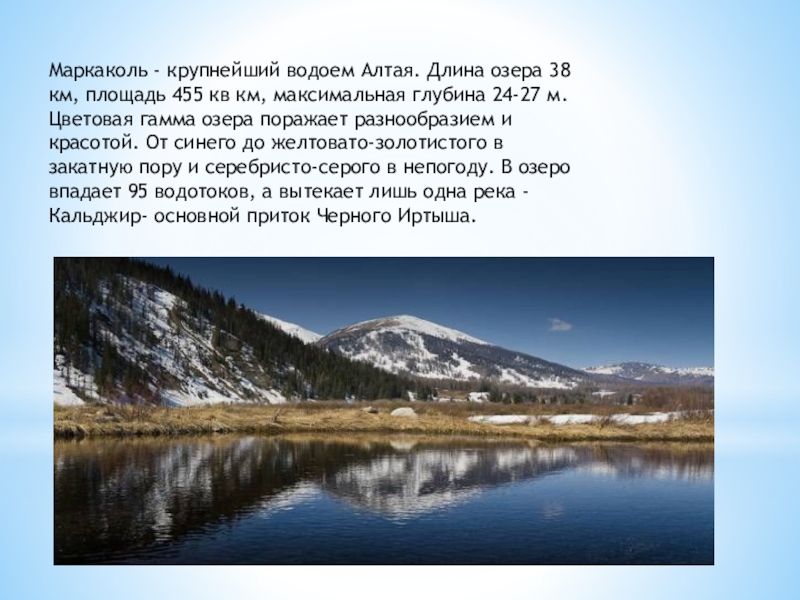 Слайд 3Маркаколь - крупнейший водоем Алтая. Длина озера 38 км, площадь 455