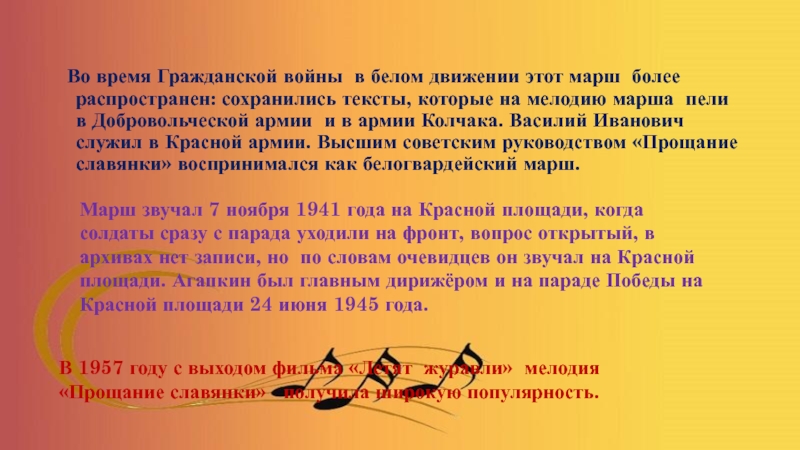 В 1957 году с выходом фильма «Летят журавли» мелодия «Прощание славянки» получила широкую популярность.