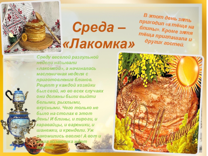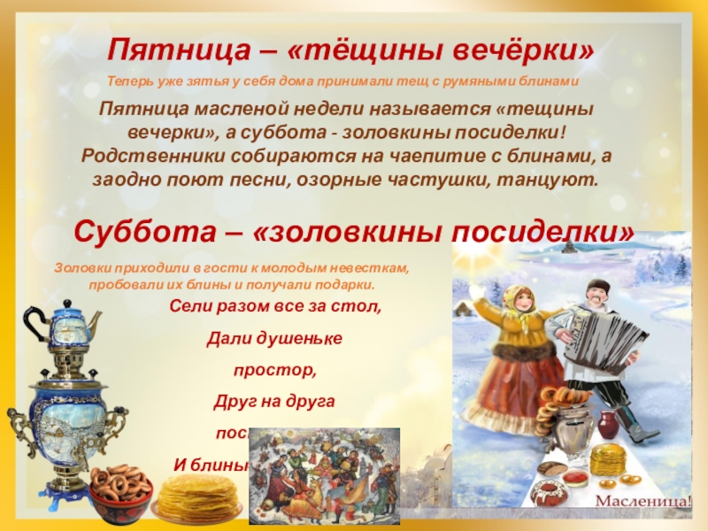 В этот день зять приходил «к тёще на блины». Кроме зятя тёща приглашала и других гостей.