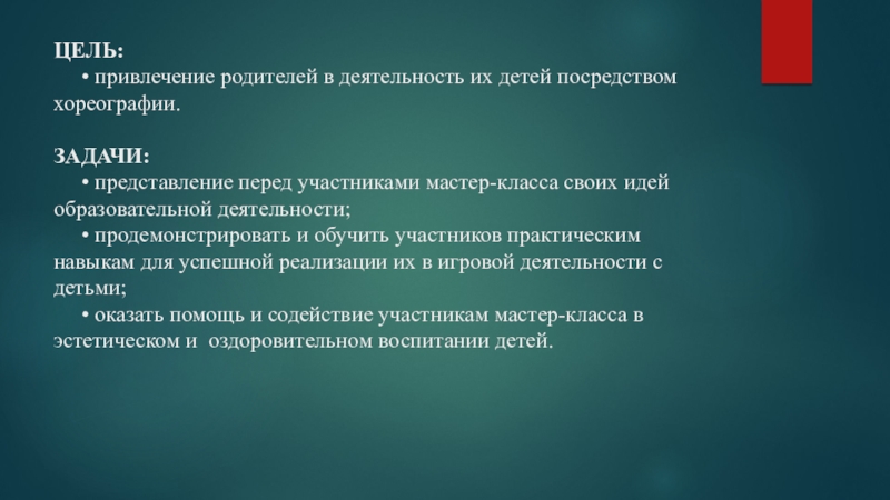 • оказать помощь и содействие участникам мастер-класса в эстетическом и оздоровительном воспитании детей.