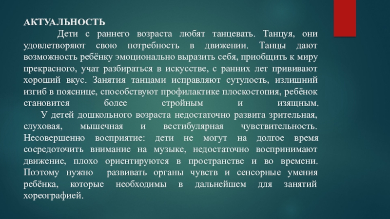 танцевать. Танцуя, они удовлетворяют свою потребность в движении. Танцы дают возможность ребёнку эмоционально выразить себя, приобщить к миру прекрасного, учат разбираться в искусстве, с ранних лет прививают хороший вкус. Занятия танцами исправляют сутулость, излишний изгиб в пояснице, способствуют профилактике плоскостопия, ребёнок становится более стройным и изящным.