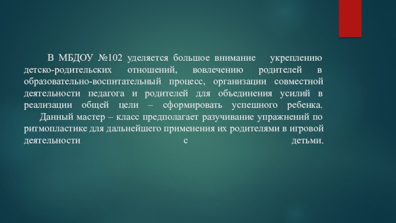 укреплению детско-родительских отношений, вовлечению родителей в образовательно-воспитательный процесс, организации совместной деятельности педагога и родителей для объединения усилий в реализации общей цели – сформировать успешного ребенка.