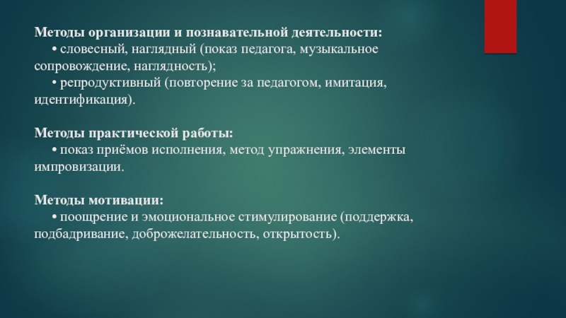 • показ приёмов исполнения, метод упражнения, элементы импровизации.