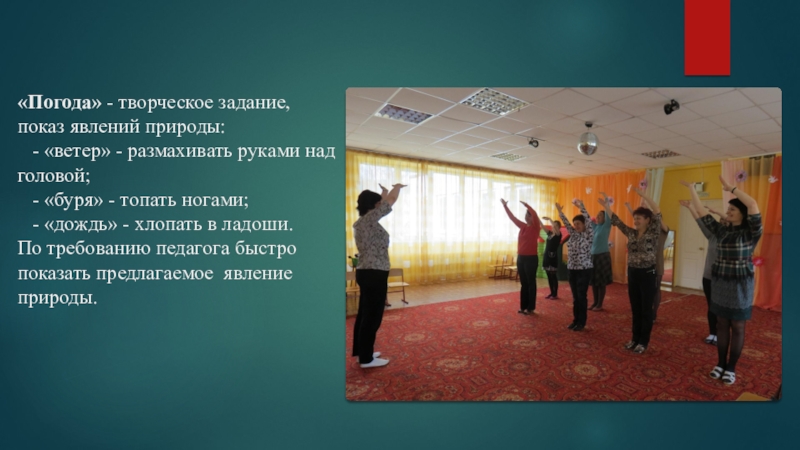 Слайд 15«Погода» - творческое задание, показ явлений природы: