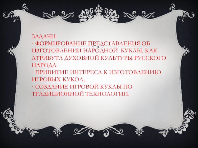 Слайд 3Задачи: · формирование представления об изготовлении народной куклы, как атрибута духовной культуры