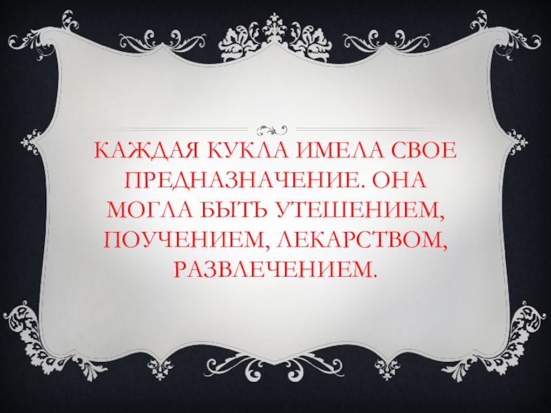 Слайд 6Каждая кукла имела свое предназначение. Она могла быть утешением, поучением, лекарством,