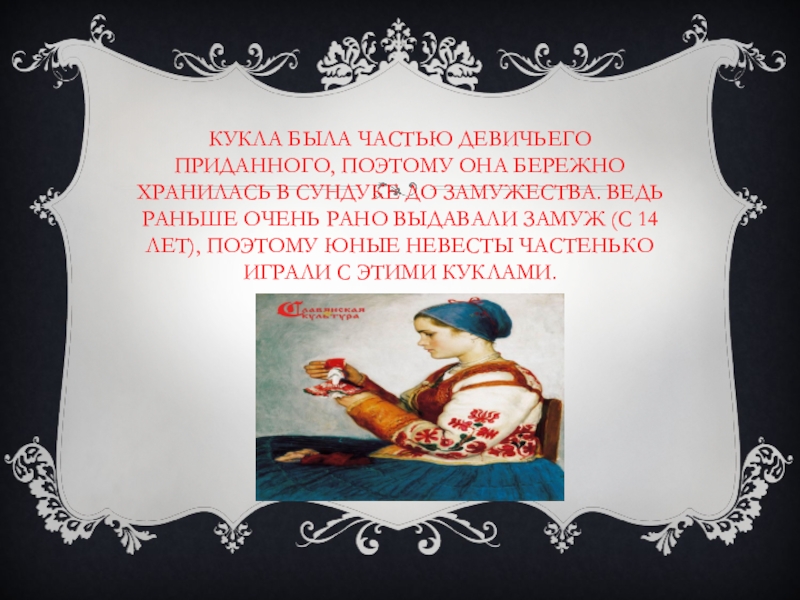 Слайд 9Кукла была частью девичьего приданного, поэтому она бережно хранилась в сундуке