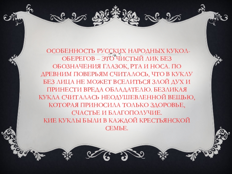 глазок, рта и носа. По древним поверьям считалось, что в куклу без лица не может вселиться злой дух и принести вреда обладателю. Безликая кукла считалась неодушевленной вещью, которая приносила только здоровье, счастье и благополучие. кие куклы были в каждой крестьянской семье.