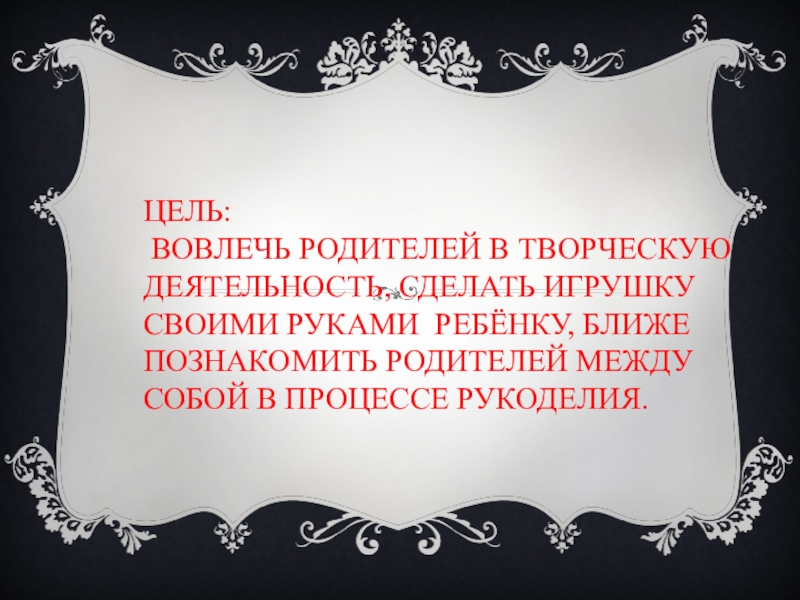 Слайд 2Цель: Вовлечь родителей в творческую деятельность, сделать игрушку своими руками ребёнку,