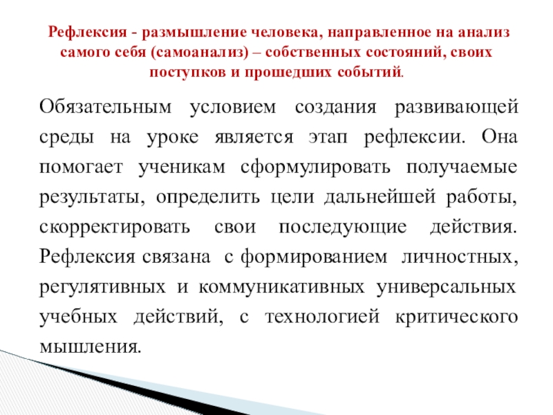Рефлексия - размышление человека, направленное на анализ самого себя (самоанализ) – собственных состояний, своих поступков и прошедших событий.