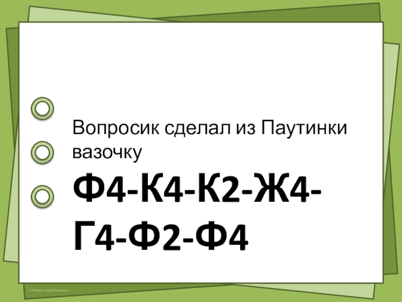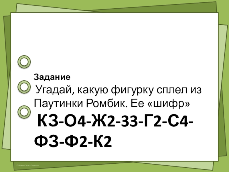 Задание Угадай, какую фигурку сплел из Паутинки Ромбик. Ее «шифр» КЗ-О4-Ж2-33-Г2-С4-ФЗ-Ф2-К2