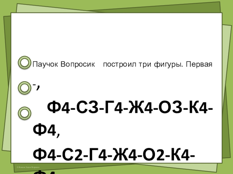 Паучок Вопросик  построил три фигуры. Первая -, Ф4-СЗ-Г4-Ж4-ОЗ-К4-Ф4, Ф4-С2-Г4-Ж4-О2-К4-Ф4.
